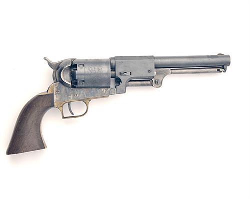 A REPRODUCTION .44 B/P PERCUSSION SIX-SHOT SINGLE-ACTION REVOLVER SIGNED ARMI SAN-MARCO, MODEL COLT DRAGOON, serial no. 7816 with blued 7 1/2in. barrel, rolled scene to cylinder, colour-hardened frame and brass grip-straps, some light wear