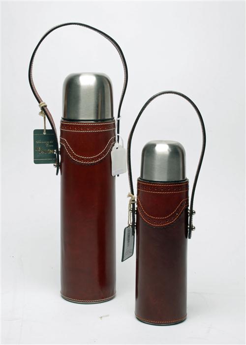 † TWO NEW & UNUSED RAY PAVON LEATHER BOUND STAINLESS STEEL THERMOS FLASKS, 1 x small, 1 x large
