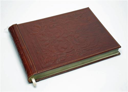 † A NEW & UNUSED REY PAVON LEATHER BOUND RECORD BOOK, embossed with foliate motifs