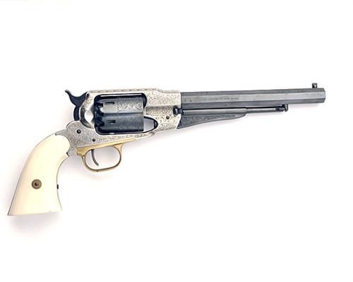 A REPRODUCTION DELUXE .44 B/P PERCUSSION SIX-SHOT SINGLE-ACTION REVOLVER SIGNED PIETTA, MODEL REMINGTON ARMY, serial no. R261029, with 8in. blued barrel with etched scroll engraving, blued, engraved cylinder and brushed bright etched engraved frame, smooth imitation ivorine grips, in its manufacturers carton, appearing unused