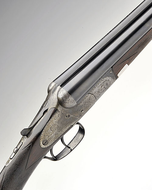 AN UNUSUAL COGSWELL & HARRISON 12-BORE 'SANDHURST' SIDEPLATED BOXLOCK EJECTOR, serial number 49119, 30in. nitro barrels with an 8 1/2in. raised rib and 21 1/2in. sunken rib, 2 1/2in. chambers, bored approx. imp. cyl. and half choke, treble-grip action, automatic safety, border and acanthus scroll engraving