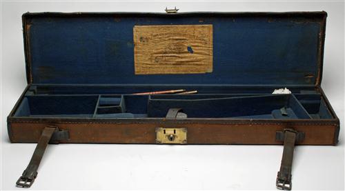 A CANVAS AND LEATHER ARMY & NAVY SINGLE HAMMERGUN CASE,