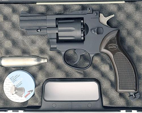 A .177 CO2 POWERED AIR-REVOLVER SIGNED GAMO, MODEL 'R77', serial no. 823118, recent, with 2 1/2in. sighted barrel, black abs cylinder and frame, brown plastic chequered grips, in it manufacturers plastic carry-case, appearing little used