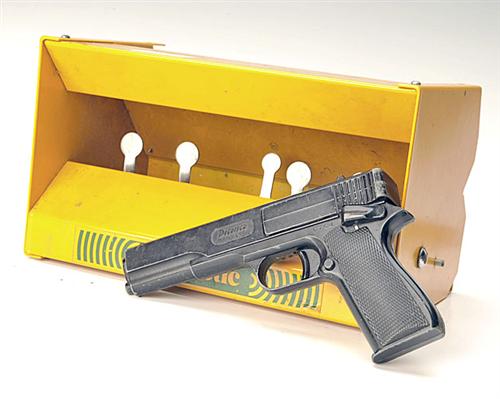 A .177 SLIDE-COCKING REPEATING AIR-PISTOL SIGNED DIANA, MODEL 'G10', no visible serial no. of standard form, (finish lightly worn) with a re-usable magnetic target/pellet trap