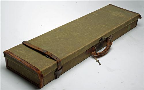 A GREEN CANVAS & LEATHER SINGLE GUNCASE, fitted for 30in. barrels, lined with red baize. brass lock (including key),