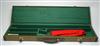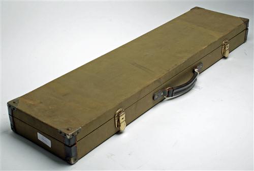 A GREEN CANVAS BRASS CORNERED SINGLE GUNCASE, fitted for 33in. barrels, lined with green baize, tow brass locks (including key)