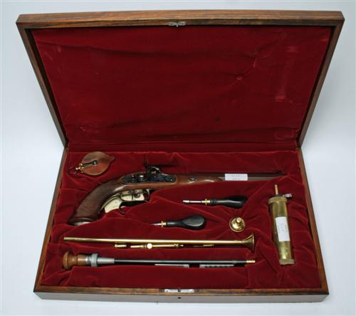 A CASED REPRODUCTION .36 PERCUSSION SINGLE-SHOT PISTOL SIGNED PEDERSOLI, serial no. PD28436, recent, with browned octagonal, sighted 10 1/2in. barrel, engraved colour-hardened lock, colour-hardened furniture, chequered walnut stock, spurred trigger-guard and set trigger, no provision for ramrod TOGETHER WITH a large walnut case containing the pistol and a number of quality reproduction accessories