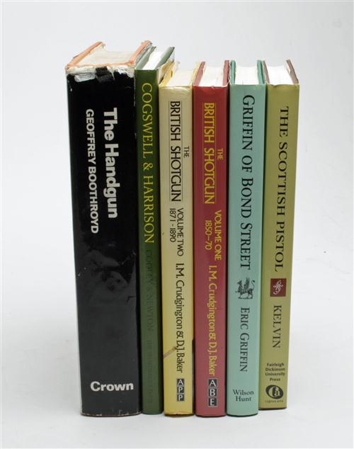 A QUANTITY OF SPORTING BOOKS, ALL EX LIBRIS GEOFFREY BOOTHROYD, the titles being; The British Shotgun Volumes 1 & 2 by Crudgington & Baker, The Handgun by Boothroyd, Game Shooting by Robert Churchill (first edition), Masterpieces of Russian Hunting Arms by Dr. Jurij Miller, Griffin of Bond Street by Eric Griffin, The Scottish Pistol by Martin Kelvin, Cogswell & Harrison by Cooley and Newton, British Gunmakers Their Trade Cards, Cases and Equipment by Keith Neal and Back, Forsyth & Co. by Keith Neal and Back, Purdey's The Guns and the Family by Richard Beaumont (first Edition), Collecting Shotgun Cartridges by Ken Rutterford, Modern Shotguns by W.W. Greener, Air Guns and Air Pistols by L. Wesley, The Rev. Alexander John Forsyth and His Invention of the Percussion Lock by Maj-Gen. Sir Alexander John Forsyth Reid, Automatic Pistol Marksmanship by William Reichenbach, all titles in good order and several containing inscriptions by Boothroyd. (16)