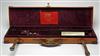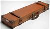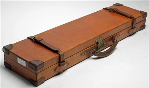 A TAN LEATHER SINGLE GUNCASE, fitted for 28in. barrels, lined with purple baize, central brass lock (key missing), oil bottle & 12 bore snap caps, Cogswell & Harrison trade label, straps & handle good