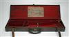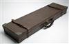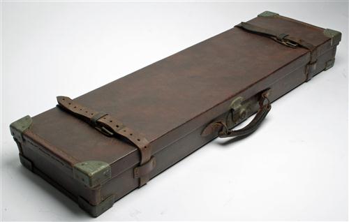 A W. PAPE BRASS CORNERED LEATHER SINGLE GUNCASE, suitable for 28in. barrels, lined with red baize, brass lock (key missing), interior lid with a W. Pape trade label, straps & handle in good order