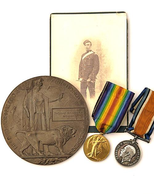 A WW1 COMMEMORATION PLAQUE (DEATH PENNY), TWO MEDALS AND PHOTOGRAPH, all pertaining to Thomas Swarbrick Redman (ASC), the medals being his British War Medal and his Victory Medal, the photo being of him in No1 dress