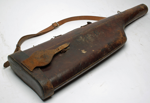 A LEG-OF-MUTTON LEATHER GUNCASE, for 30in. barrels, lined with red baize, brass lock (key missing), handle & shoulder strap, with the monogram S.B.B.
