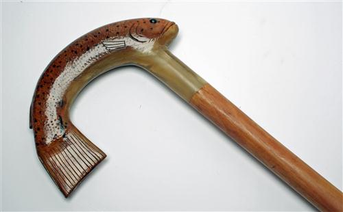 A SPORTSMANS WADING STAFF, with an un-tipped softwood shaft, the head moulded, painted into the shape of a leaping trout