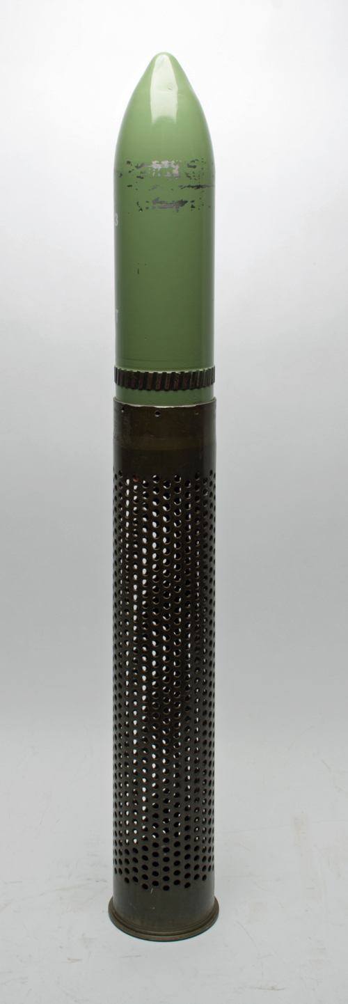 shell with pre-engraveed copper driving band, the cartridge case perforated overall to allow for gas escape during firing, shell repainted.