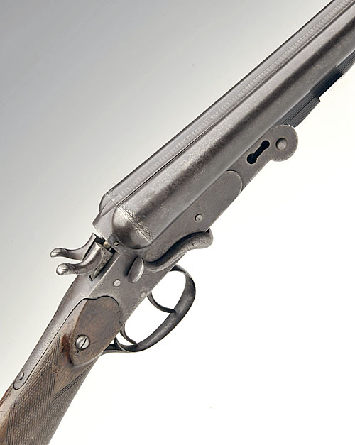 BELGIAN 12-BORE DOUBLE-BARRELLED SIDELEVER FOLDING HAMMERGUN, n.v.s.n., 24 5/8in. black powder barrels, 2 1/2in. chambers, bored approx. true cyl. and 3/4 choke, barrel catch missing, stock cracked and repaired