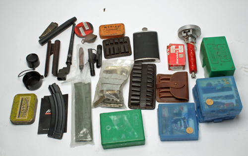 A BOX OF GUN RELATED ITEMS, including a Webley Target Launcher, cartridge wallets, hand guards, hip flask and other gun related items