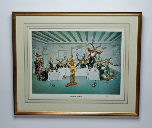 A FRAMED GLAZED LIMITED EDITION OF 'THE STAG PARTY' no 141 of 350, together with