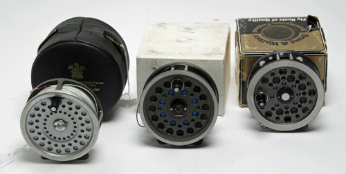 THREE SALMON REELS, including a Hardy Brothers Ltd 4in. 'Matquis' Salmon No 2 in a Hardy Bros Ltd case, a Bruce Walker 4 1/4in. Expert Series salmon reel in its original carton, a Bruce & Walker 4 1/4in. Masterline DT 10SF in its makers carton