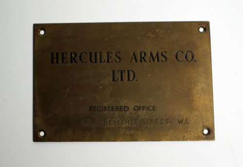 HERCULES ARMS, ORIGINAL CERTIFICATE OF INCORPORATION AND NAME PLATE, a) 1959 Certificate of Incorporation No 645713 of The Hercules Arms Co Ltd, b) 1972 - 1974 Hercules Arms Co Ltd brass name plate (4" x approx 6") showing the registered office as 43 Albemarle Street London W1
