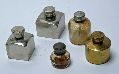 FIVE VINTAGE OIL BOTTLES, the first a spuriously signed Boss, 2nd a John Rigby & Co, a C. & J.W. Hawksley glass bottle, a T.F. Wood & Son bottle & an other glass oil bottle