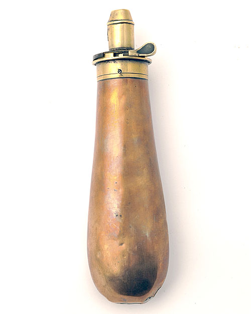 AN ENGLISH COPPER-BODIED BAG-SHAPED POWDER FLASK,