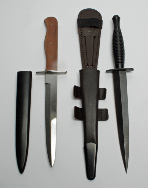TWO MILITARY KNIVES, the first a modern an F.S. model commando knife in its leather scabbard, the second a repro WWI German Boot Knife