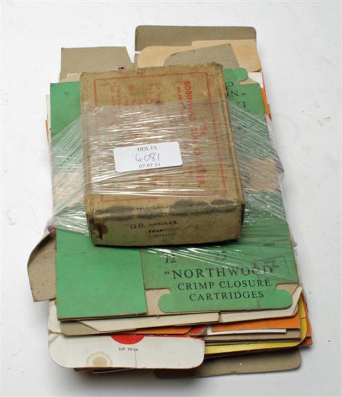 A G.L WOODS CARDBOARD CARTRIDGE FOR 100 12 BORE "UNIVERSAL CARTRIDGES" TOGETHER WITH THE TOP HALF OF A SIMILAR BOX FOR 100 16 BORE NO 6 SHOT CHURCHILL CARTRIDGES AS WELL AS APPROX 20 CARDBOARD SHOTGUN CARTRIDGE BOXES FOR ELEY, H&H, CORDINGS MATCHLESS ETC. IN DIFFERENT SHOT SIZES AND CALIBRES - PLUS A "BOBINWAD GUN CLEANER IN ORIGINAL BOX
