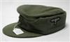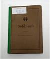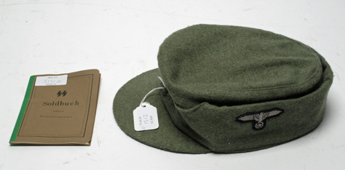 A REPRODUCTION WAFFEN SS CAP AND 'SOLDBUCH' the first in olive green with 'Bevo' woven insignia, the second unused
