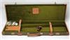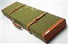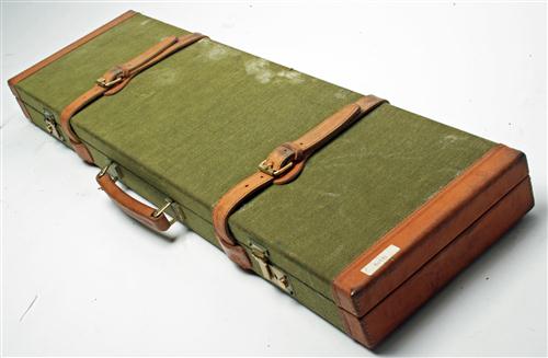 A CANVAS & LEATHER SINGLE GUNCASE, fitted for 30in. barrels, suitable for over & under barrels, lined with green baize, two brass locks (keys missing)