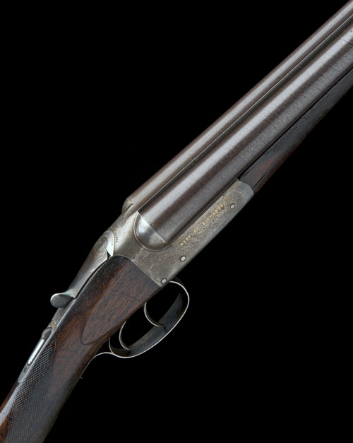 28in. nitro reproved damascus barrels, rib marked 'WESTLEY RICHARDS. 178 NEW BOND ST. LONDON.', 2 1/2in. chambers, bored approx. true cyl. and 1/4 choke, treble-grip action, Westley Richards patent toplever, automatic safety with gold-inlaid 'SAFE' detail, plain action with the makers name inlaid in gold, retaining traces of original finish, 12 3/8in. stock, slight cracks to fore-end wood, weight 5lb. 5oz.