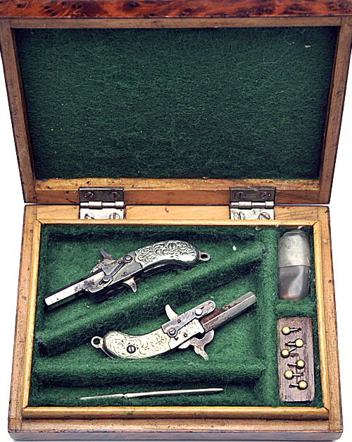 German, circa 1930, with nickel-plated hexagonal 11/16in. barrels, nickel-plated frames with central hammers, external barrel locking springs and white metal scroll-engraved bag-shaped grips TOGETHER WITH a later amboyna burl fitted case, compartmented and lined in green baize, with provision for six rounds (blanks included), a clearing rod/ turnscrew combination tool and a celluloid spare ammunition capsule