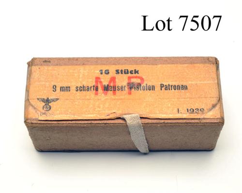 SIXTEEN VINTAGE AND COLLECTABLE ROUNDS OF 9MM PISTOL AMMUNITION IN GERMAN SERVICE ISSUE BOX DATED 1939 AND MARKED FOR MAUSER PISTOLS