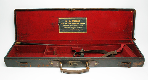 A SINGLE LEATHER HAMMERGUN CASE, fitted for 30in. barrels, lined with maroon baize, brass lock (key missing), the interior lid with a W.W. GREENER trade label, the exterior with the monogram O.G.