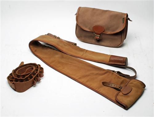 A CANVAS & LEATHER GUNSLIP, A CANVAS & LEATHER CARTRIDGE BAG & A CANVAS & LEATHER CARTRIDGE BELT