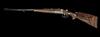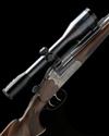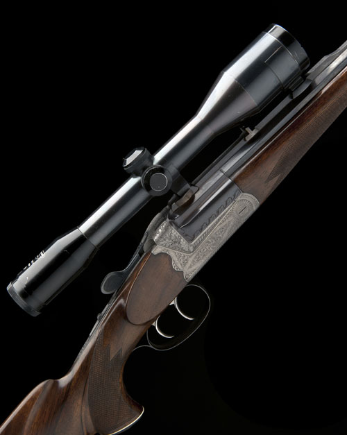 25 5/8in. nitro reproved octagonal barrel (re-chambered from 5,6x57R), matt top-rib and raised sight-rib with open sights, ramped gold bead fore-sight, the breech end mounted with a Swarovski Habicht 6 telescopic sight in quickly-detachable mounts, scroll-back quadruple-grip action with side-bolsters, removable striker disc, automatic safety, set triggers, oak leaf and acanthus scroll engraving, the underside with a roe buck, 14 1/8in. figured pistolgrip stock with sculpted cheekpiece, missing sling swivel, pistolgrip-cap inlet with escutcheon engraved with initials 'PH', the butt with a band of carved oak leaves, including 7/8in. ventilated rubber recoil pad, weight 8lb. 2oz.
