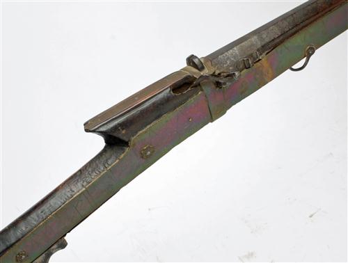 A 20-BORE MATCHLOCK 'TORADOR' MUSKET, Indian, circa 1860, with octagonal, sighted, 49in. barrel, brass-mounted wooden 'tiller' style three-quarter stock with nine brass barrel-bands and exposed trigger