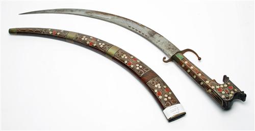A MOROCCAN NIMCHA-STYLE SHORT-SWORD, for the tourist market, with heavily curved 16in. blade and wood hilt and scabbard with inlayed metal decoration