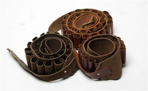 THREE CARTRIDGE BELTS, one 12-bore leather cartridge belt, one 12-bore canvas cartridge belt, one canvas & leather 28-bore cartridge belt.