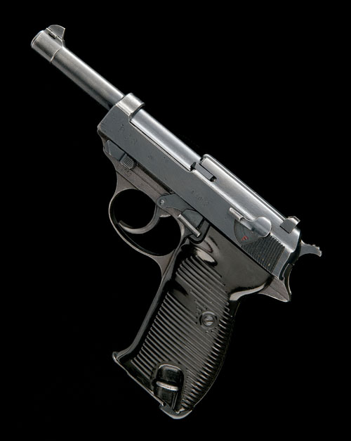circa 1944/45, with 5in. sighted barrel (proved 2011), waffenampt marked slide with model designation and makers mark 'cyq', further ordnance marks to the steel frame, brown grooved bakelite grips (cracked), original magazine, the whole retaining much wartime finish TOGETHER WITH a spare magazine (both magazines stamped 'P38' over 'U' and marked with the makers code 'jvd' for 'Erste Nordbohemiche Metal Fabrik)