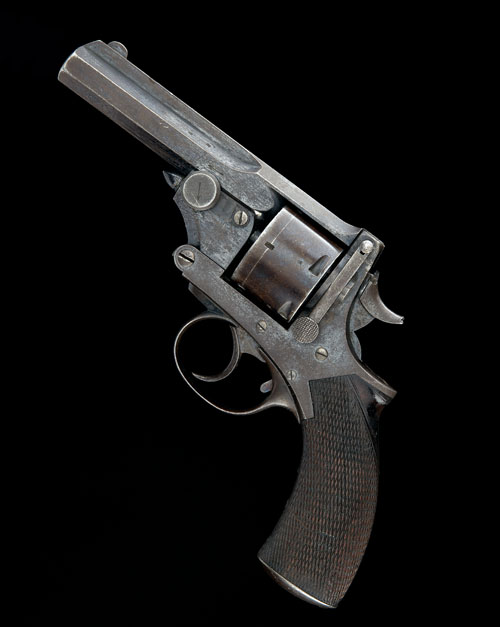 circa 1880, with octagonal 4in. barrel, the raised sighting rib signed 'T. W. WATSON, 4 PALL MALL LONDON', blade fore-sight, notch rear-sight, plain cylinder, plain hinged frame stamped 'PATENT 1987?' in a diamond shaped border, twin 'Pryse' levers (stiff to open), chequered walnut one-piece grip, iron butt-cap with provision for lanyard ring (missing), traces of original finish