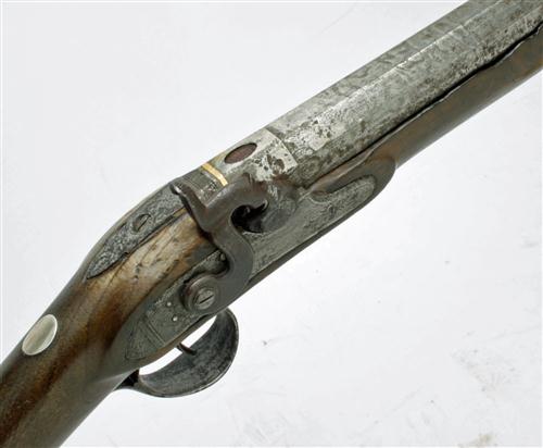 A 12-BORE PERCUSSION SINGLE-BARRELLED SPORTING GUN, UNSIGNED, converted from flintlock circa 1850, with 32in. triple-staged barrel, patent breech with gold line, bar-action lock, chequered walnut half-stock with raised cheek-piece, missing ram-rod (external surfaces worn and corroded with minor losses)