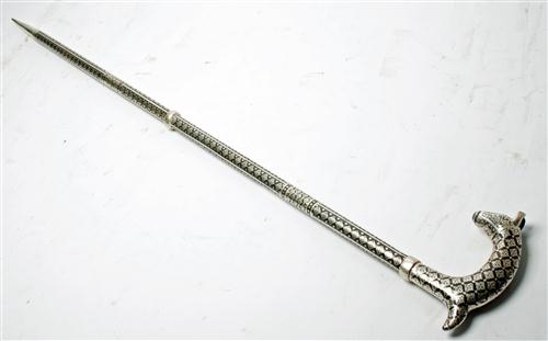 AN IRON WALKING STICK WITH SILVER KOFTGARI-WORK, 20th century, 38 1/2in. in length with a stylised animal head handle