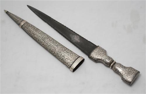 AN INDIAN SILVER-DAMASCENED KNIFE WITH ROSE-DAMASCUS BLADE, 20th century, with double edged serrated 12in. blade, inlaid cartouche to one side, with sheet metal hilt and scabbard profusely decorated with silver damascening