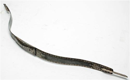 A SILVER DAMASCENED INDIAN STEEL SHORT-BOW, twentieth century, watered steel demountable construction, unstrung