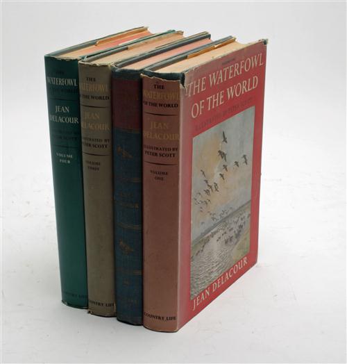 FOUR VOLUMES OF 'THE WILDFOWL OF THE WORLD' BY JEAN DELACOUR.