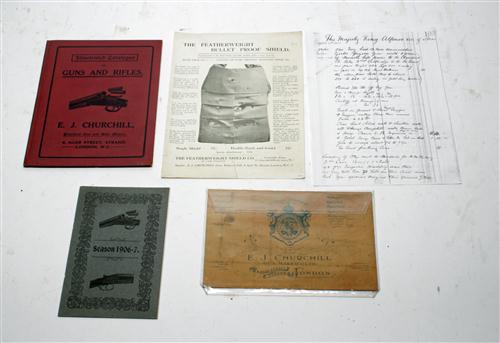 copy of King Alfonso XIII's gun order dated April 1st 1905, copy of the 1905 order for the Infanta Isabel of Spain, a 32 page pre World War I red hard illustrated catalogue for E.J. Churchill ' BY SPECIAL APPOINTMENT TO THE KING OF SPAIN' around the Spanish crest on the first page,