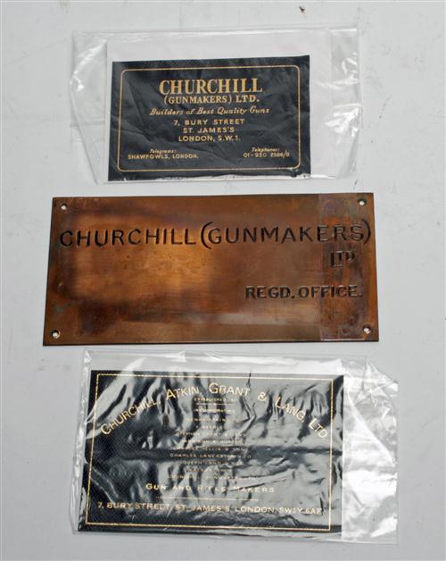c) Copper name plate (4 in x 8 in) for CHURCHILL (GUNMAKERS) LTD from Orange Street,