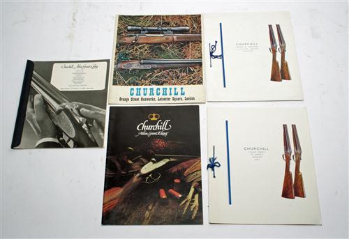 SEVEN CHURCHILL (GUNMAKERS) CATALOGUES PLUS FLYER, 1963-1981, a) CHURCHILL'S 1963 ORANGE STREET gun catalogue with a Churchill 12 bore Premier with 25 in barrels and a Churchill de Luxe Sporting rifle