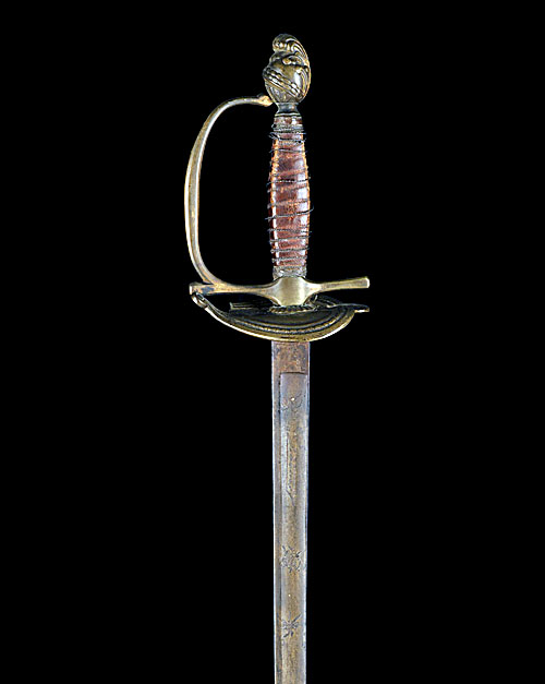 A FRENCH CONSULATE PERIOD INFANTRY SWORD, circa 1800, with straight 30 1/2in. blade, typical boat-shaped shell guard and plumed helmet pommel, hilt binding loose, guard damaged, no scabbard