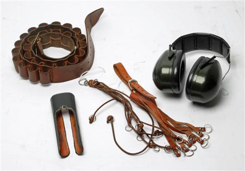 TWO BIRD CARRYING SLINGS, A PAIR OF AIR DEFENDERS & A CARTRIDGE BELT. together with a 12-bore hand guard.